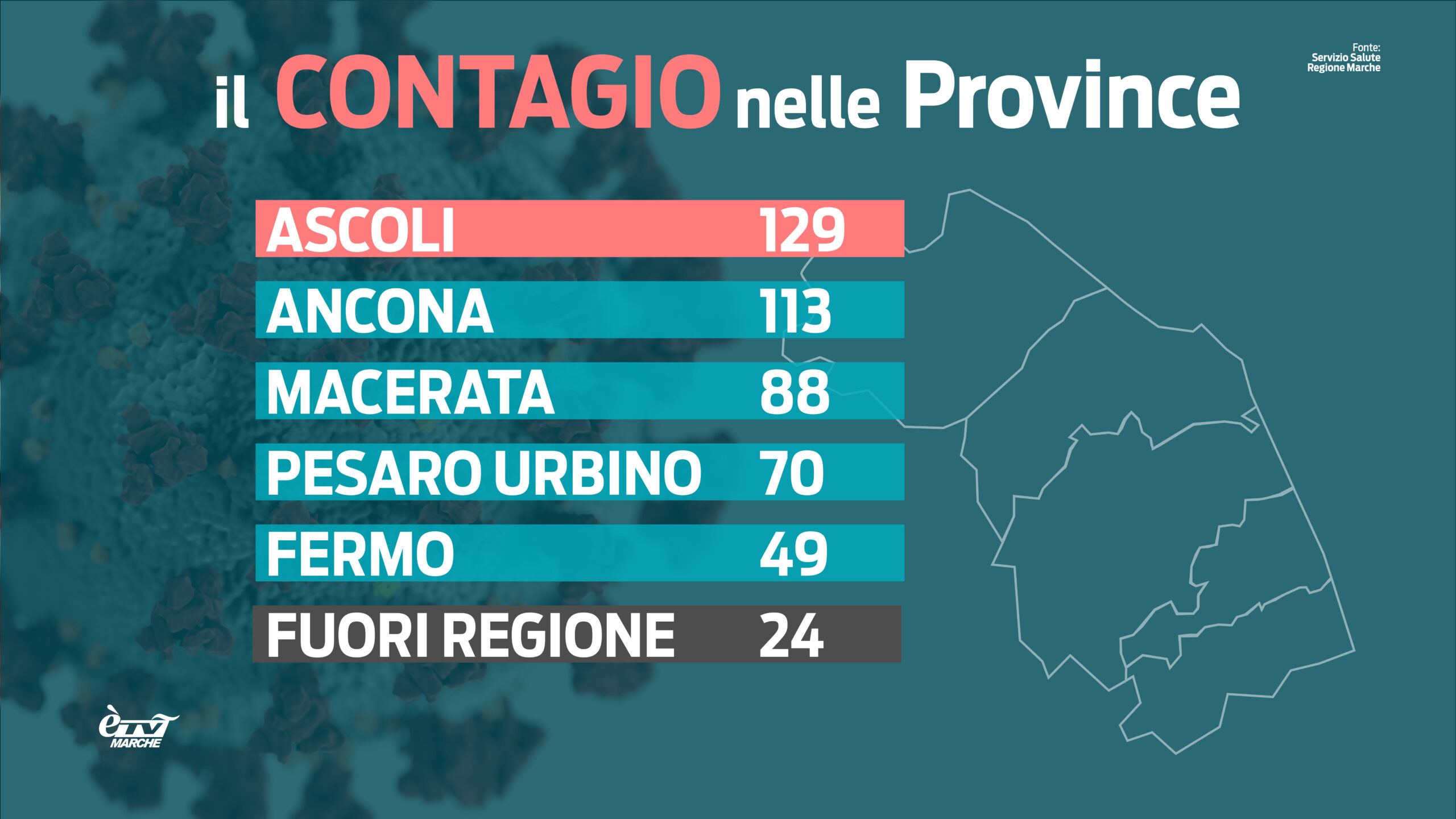 Tra gli ultimi casi ci sono 159 persone con sintomi; comprendono 137 contatti stretti di positivi, 86 contatti domestici, 2 in ambiente di vita/socialità, 2 in setting assistenziale, uno ciascuno in setting scolastico/formativo, lavorativo e sanitario. Su 81 positività in corso un approfondimento epidemiologico. In provincia di Ascoli Piceno il numero più alto di casi nell’ultima giornata (129); seguono Ancona (113), Macerata (88), Pesaro Urbino (70), Fermo (49); 24 i casi provenienti da fuori regione. Tra le fasce d’età si registrano 141 positivi in quella tra 45-59 anni e 136 in persone tra i 25 e 44 anni.