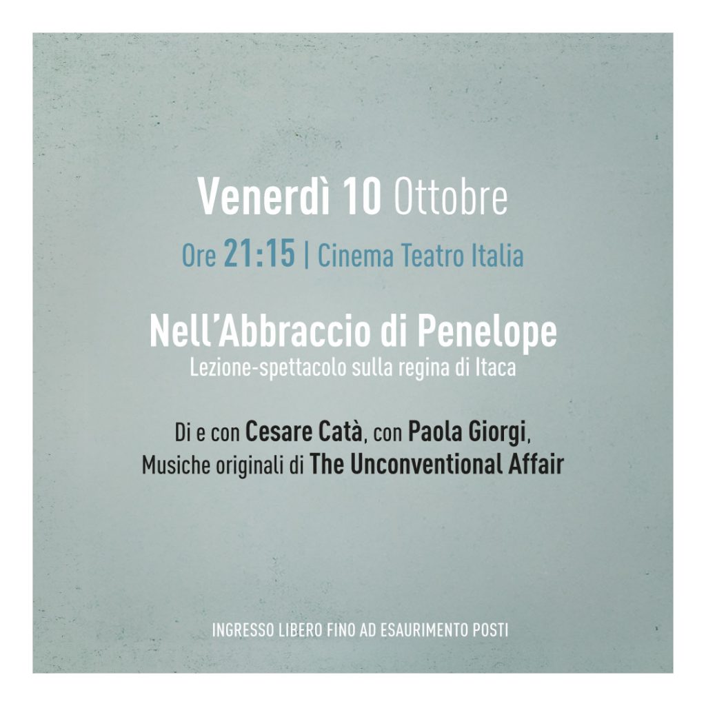 Venerdì 10 ottobre – Teatro Italia ore 21,00 – Inaugurazione alla presenza delle autorità a seguire “Nell’abbraccio di Penelope – Lezione spettacolo sulla Regina di Itaca” di Cesare Catà. Con Paola Giorgi e Cesare Catà. Musiche originali dal vivo: The Unconventional Affair. Un viaggio poetico attorno alla figura di Penelope, simbolo dell’attesa e della fedeltà. Lo spettacolo unisce filosofia, letteratura e stand-up comedy per restituire la modernità e la profondità della Regina di Itaca, attraverso la voce e il corpo di Paola Giorgi e la narrazione intensa e ironica di Cesare Catà. A fare da tessitura sonora, le musiche evocative del duo The Unconventional Affair. La figura di Penelope viene raccontata a partire dai versi di Omero, riletta nella toccante epistola ovidiana delle Heroides e nei versi del poeta greco contemporaneo Kavafis, che ne celebra la dignità e l’inesausta forza. Penelope è l’archetipo della donna che crea senso con l’attesa: ogni giorno che passa è un atto poetico. In piena coerenza con il progetto NOSTOS, lo spettacolo esplora il ritorno come metafora esistenziale e il gesto dell’attendere come una potente forma di resistenza e d’amore.