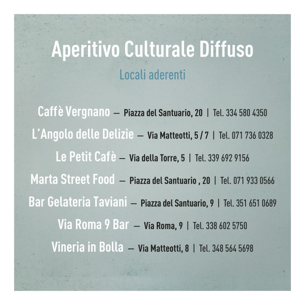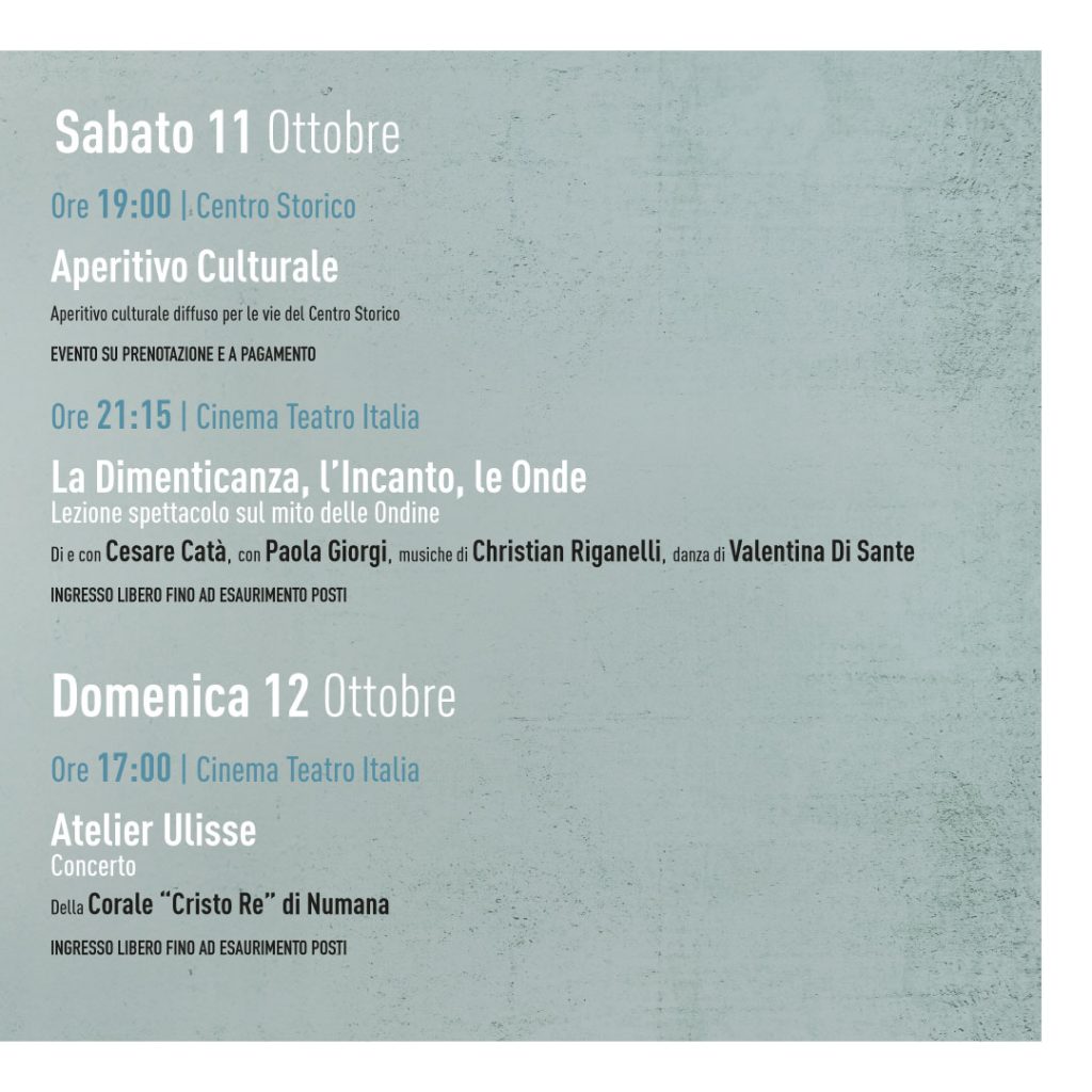 Domenica 12 ottobre – ore 17:00 – Teatro Italia “Atelier Ulisse” – Concerto Corale “Cristo Re” di Numana. Tutti gli eventi saranno ad ingresso gratuito tranne ove specificato (Aperitivo culturale).