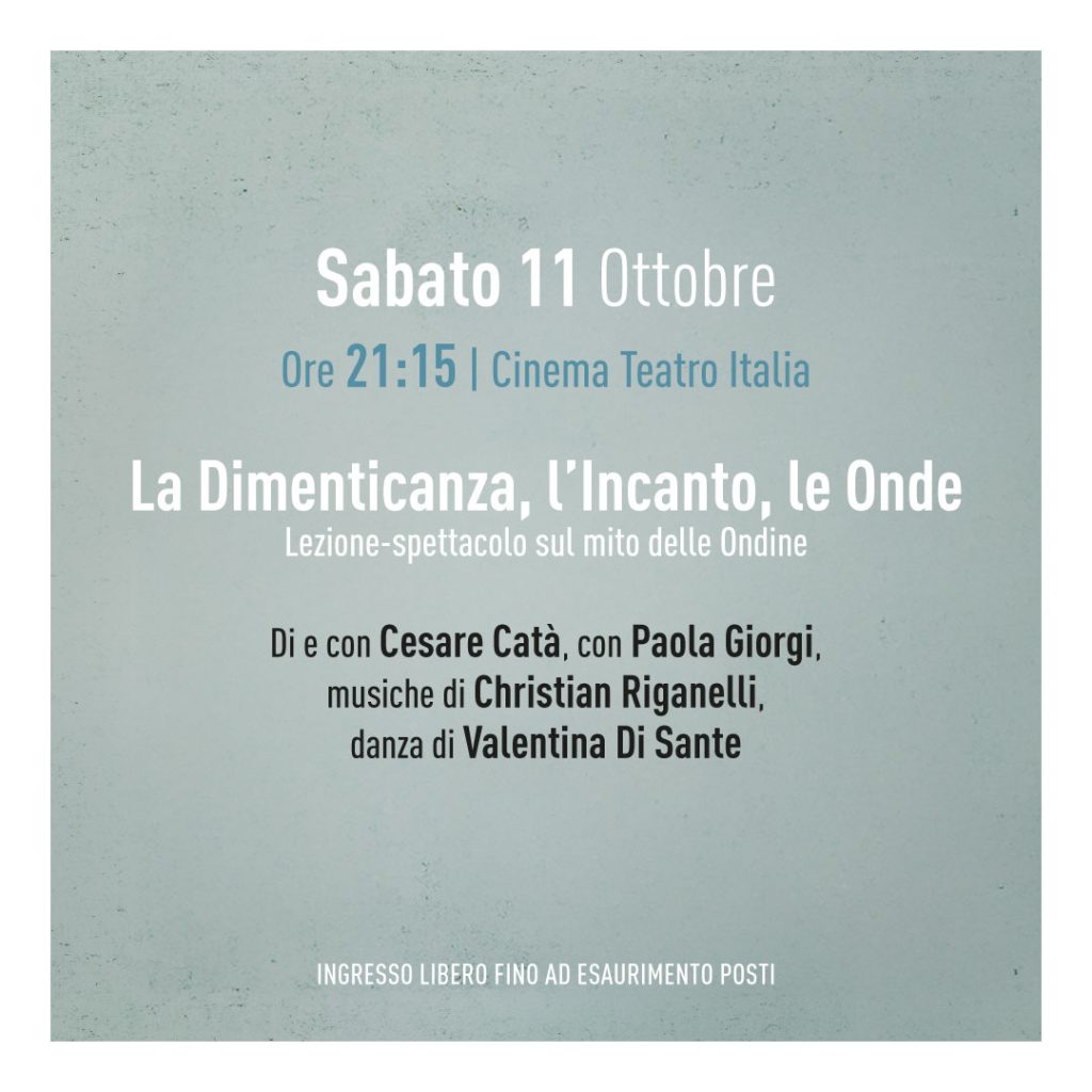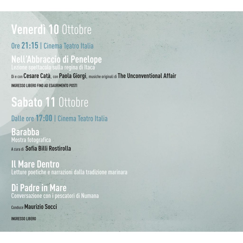 Sabato 11 ottobre – Teatro Italia e centro storico ore 17:00 – Inaugurazione Mostra fotografica “Barabba” di Sofia Billi Rostirolla ore 17:30 – “Il mare dentro” – Letture poetiche e narrazioni dalla tradizione marinara ore 18:00 – “Di padre in mare” – Conversazione con i pescatori di Numana Il pomeriggio dell’11 ottobre si sviluppa come un trittico poetico che declina in forma partecipata e comunitaria i temi del progetto NOSTOS: memoria, identità, ritorno. Con la conduzione del giornalista e presentatore Maurizio Socci, ogni appuntamento accompagna il pubblico in una narrazione viva del borgo e della sua cultura del mare. – Con la mostra fotografica “Barabba”, a cura di Sofia Billi Rostirolla, la poesia diventa immagine e sguardo interiore: la figura del nonno pescatore è restituita come simbolo di un tempo che ritorna attraverso gli occhi della memoria. – “Il mare dentro” propone letture poetiche e racconti ispirati alla tradizione marinara di Numana: un gesto corale, fatto di voci e versi, che rievoca l’anima del borgo. – “Di padre in mare” è una conversazione tra generazioni: i pescatori di oggi raccontano il presente e il passato del mestiere, offrendo al pubblico una testimonianza autentica di come la cultura del mare si trasmetta e si trasformi. Tutti e tre i momenti condividono la stessa poetica del progetto: riscoprire, ascoltare, ritornare. NOSTOS non è solo viaggio, ma anche radicamento, racconto e identità in divenire. Ore 19:00 – Aperitivo culturale diffuso nel centro storico (evento su prenotazione a pagamento) Ore 21:15 – “La Dimenticanza, l’Incanto, le Onde” – Lezione spettacolo sul mito delle Ondine di Cesare Catà. Con Paola Giorgi e Cesare Catà. Musiche originali dal vivo del M° Christian Riganelli. Coreografie e danza: Valentina Di Sante. Un viaggio poetico e mitologico attraverso leggende e simboli della donna acquatica. La lezione-spettacolo fonde narrazione, filosofia, danza e musica in una performance che esplora la memoria archetipica e il potere evocativo delle acque. Dalle Naiadi greche alle Selkie celtiche, fino alle leggende del Conero. Anche questo spettacolo è fortemente connesso al concetto di NOSTOS. Le Ondine, figure femminili acquatiche, rappresentano il richiamo del mare e delle origini, il legame con la natura ancestrale e con la parte più misteriosa dell’identità. L’acqua che avvolge, nasconde e restituisce è metafora del viaggio interiore. La lezione-spettacolo crea un ponte tra mitologie diverse, restituendo senso e forma alla poesia dell’inconscio. In questo spettacolo, il ritorno è l’ascolto del mito come chiave per interpretare il presente.