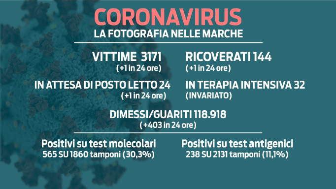 Sul fronte ospedaliero ci sono 144 malati Covid ricoverati, uno in più rispetto a ieri. Di questi 32 lottano per la vita in terapia intensiva. Sale il bilancio delle vittime della pandemia: sono 3171 persone nelle Marche con l’ultimo recesso registrato nelle ultime 24 ore. Si tratta di un uomo di 83 anni di Senigallia, già afflitto da altre patologie.