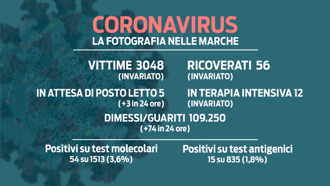 Tra i 54 nuovi contagi 24 si sono registrati in provincia di Pesaro Urbino; seguono le province di Ancona (15), Fermo (7) e Macerata (4); zero casi nell’Ascolano, quattro da fuori regione. Le persone con sintomi sono 11; i casi comprendono 13 contatti di positivi, 16 contatti domestici, quattro in ambiente di scuola/formazione e uno in ambiente lavorativo; sei casi sono in fase di approfondimento epidemiologico. In totale i tamponi eseguiti sono 2.644 di cui 1.513 nel percorso diagnostico di screening (3,6% di positivi) e 1.131 nel percorso guariti, a cui si sommano 835 test antigenici (15 positivi rilevati).