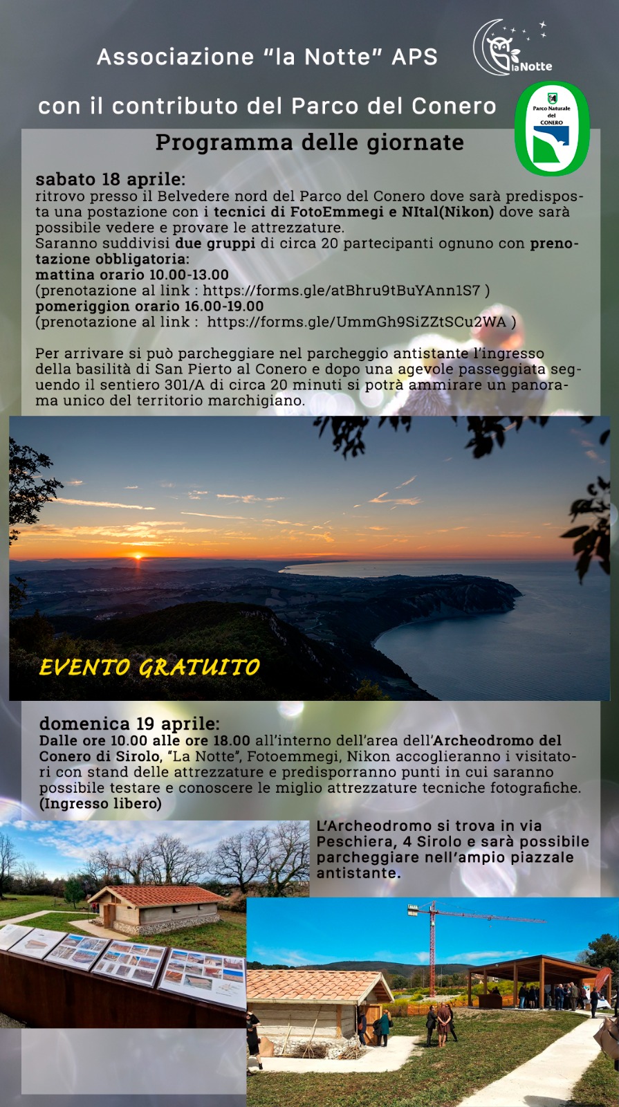 La due giorni prevede che la tarda mattina e il pomeriggio di sabato siano dedicati al paesaggio e alla natura da Belvedere Nord mentre domenica mattina ci si concentrerà all’Archeodromo del Conero a Sirolo per immortalare i manufatti di archeologia sperimentale e l’ambientazione di una casa picena di 2500 anni fa.
