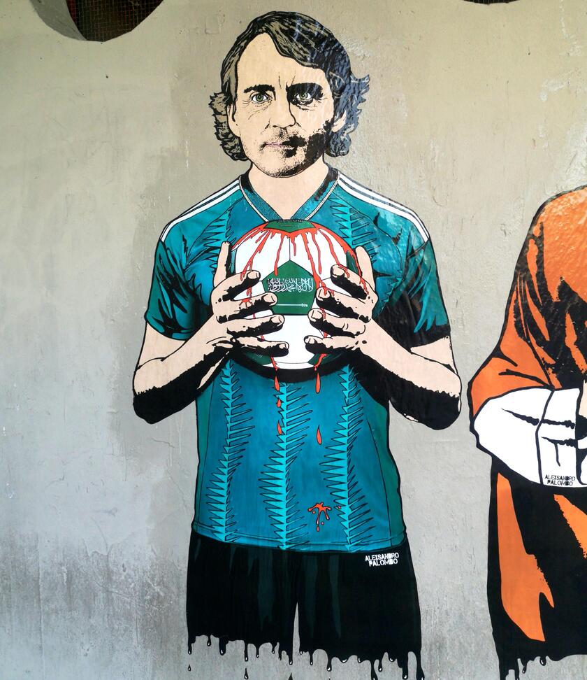 “Palombo ha realizzato – si legge in una nota dell’artista -delle opere di sensibilizzazione che ritraggono alcune star del calcio che hanno deciso di prestare il loro volto con ingaggi stellari al regno saudita di Mohammed bin Salman, dove la situazione sulla violazione dei diritti umani è molto grave”. Roberto Mancini, Bin Salman, Ronaldo, Benzema e Neymar sono apparsi sui muri della storica biglietteria sud del San Siro dove ieri si è disputata la partita di Champions League tra il Milan e il Newcastle la squadra inglese “che – viene sottolineato nella nota – nell’ottobre 2021 è stata acquistata dal Public Investment Fund (PIF) il fondo sovrano dell’Arabia Saudita controllato dal principe Mohammed bin Salman che ha acquisito anche il 70% dei quattro grandi club della Saudi Pro League, Al Nassr, Al Ittihad, Al Ahli e Al Hilal”.