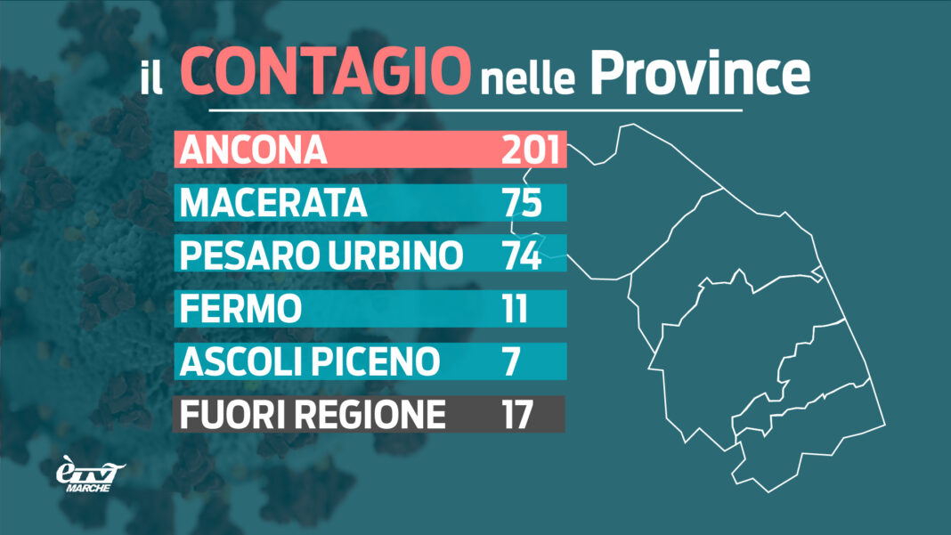 A registrare il numero maggiore di positivi la provincia di Ancona con 201 casi, in netto stacco rispetto al resto della regione, subito dopo infatti si trova la provincia di Macerata con 75 contagiati, seguita da Pesaro-Urbino 74, Fermo 11 e Ascoli Piceno 7. Sono invece 17 i casi da fuori regione.