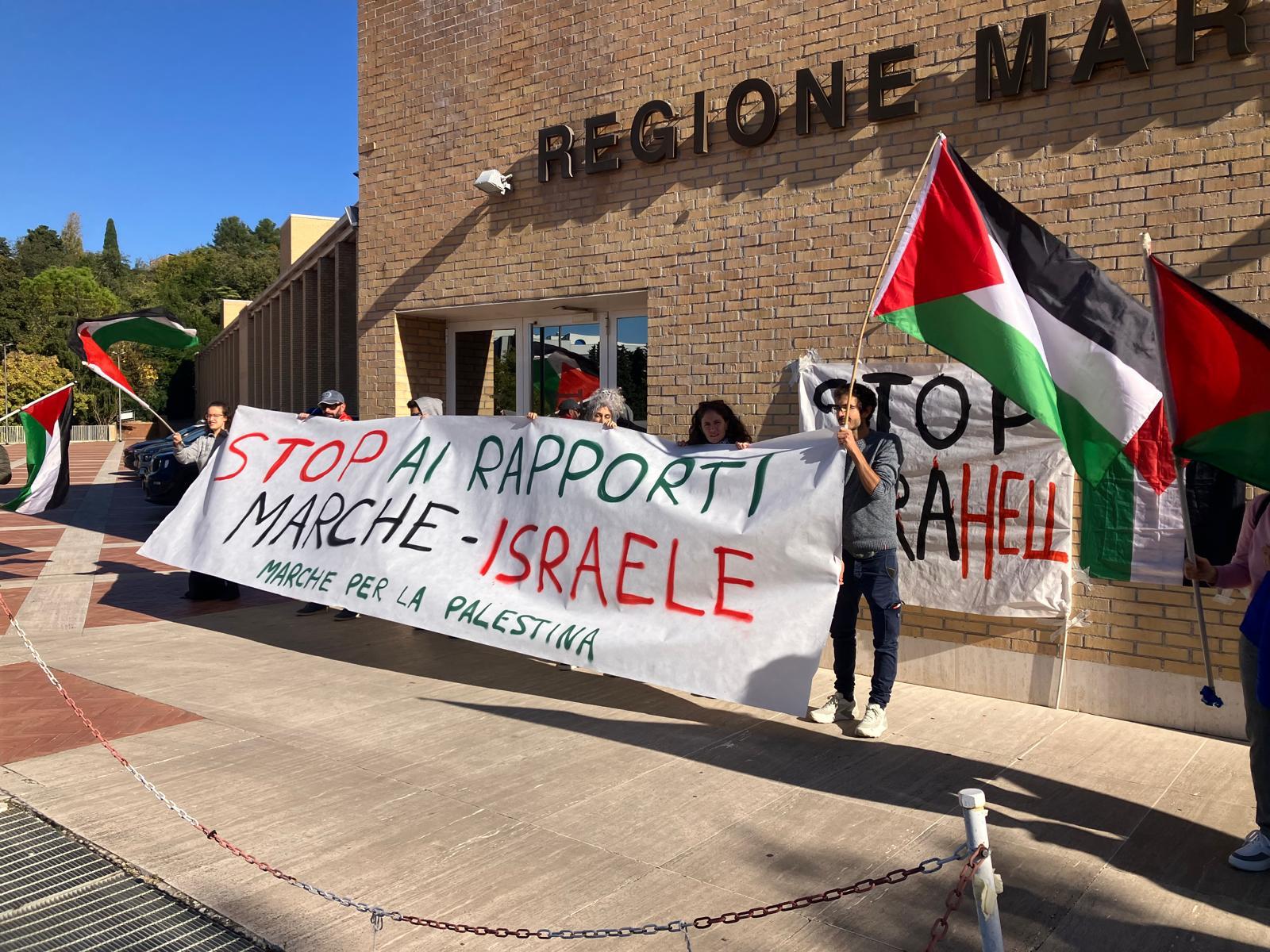 Di fronte a Palazzo Leopardi, sede del consiglio Regionale, il coordinamento Marche per la Palestina ha organizzato questa mattina un sit-in di protesta. “Abbiamo già raccolto più di 5mila firme. – ha detto un attivista al megafono – Chiediamo l’interruzione di ogni tipo di rapporto economico, culturale e accademico con uno Stato genocida”