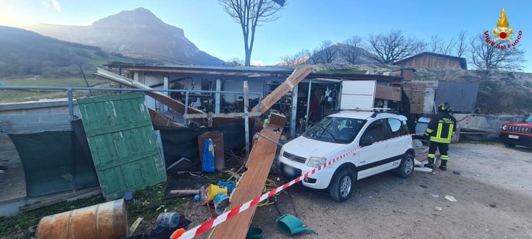 MONTEFORTINO – Terribile esplosione oggi poco prima delle 13 in località Vetice, a Montefortino. Un capanno in legno e acciaio è stato completamente dilaniato, una parete ed il tetto, in legno e perlinato, sono state espulsi dalla struttura. All’interno, al momento dell’esplosione, si trovava un giovane.