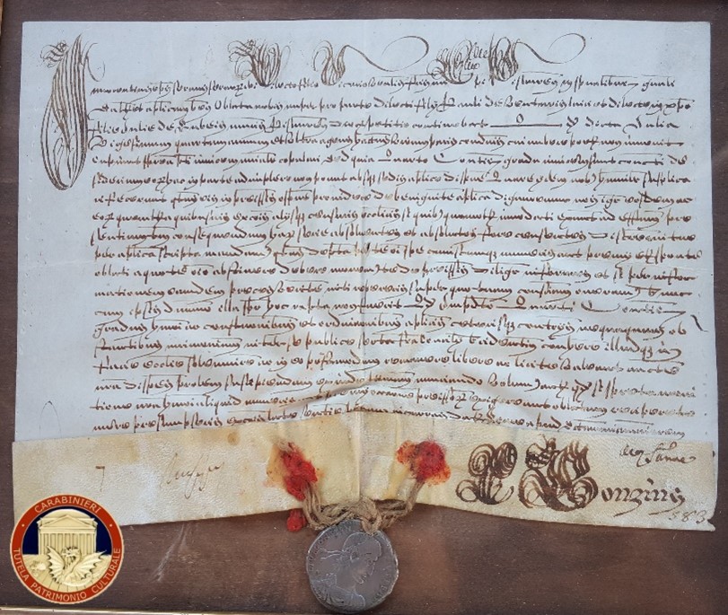 Il documento, una lettera manoscritta datata 8 maggio 1673, era stato individuato nel 2018 durante i controlli al mercato mensile dell’antiquariato di Campello sul Clitunno, nel Perugino, dove era stato messo in vendita in uno stand espositivo.